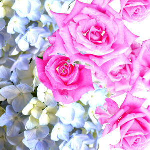 Photographic pink rose and blue hydrangea design print. Design printed on high quality fabric, please pick your fabric base in the drop-down menu below. Fabric is measured, cut and sold by the metre.