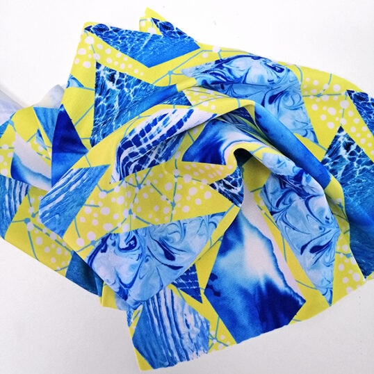 Blue Diamonds – a bright abstract pattern featuring underwater photography, shibori, and watercolour paintings. Inspired by fun days at the beach in the sunshine.