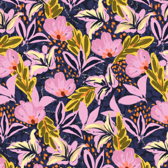 Carlotta is a vibrant print, bursting with life and colour inspired by neighbourhood gardens and sidewalk foliage in a striking palette of lilacs, midnight blues and chartreuse greens. The pink flower is approximately 3.5cm. The largest leaf is aroun