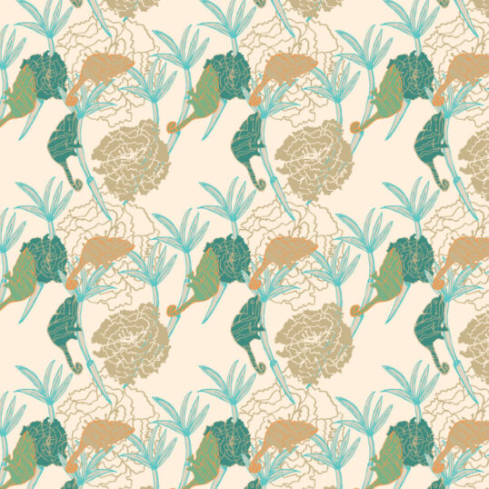 Chaemeleon Sand draws influence from imaginary travels back in time through the silk road trading routes. Marigold motifs combine with chameleons and rich tones of gold and teal in this design. Smallest motif is 4cm x4.5cm and the largest is 17cm x7c