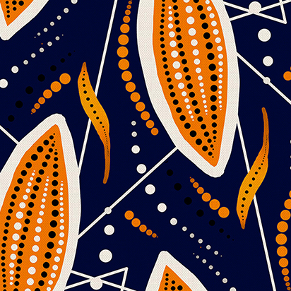 An abstract hand illustrated print of cocoa pods with geometric motifs in deep blue, yellow and orange hues. This is a large-scale multidirectional print with the main orange cocoa pod motis approximately 12 cm in size.