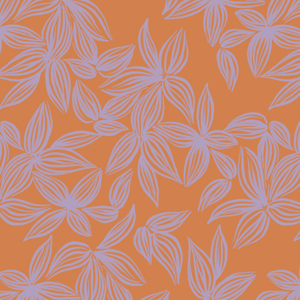 Coree is an abstract design with sweeping linear details in a simple two colour palette of local dusty lavender and burnt orange. This is a larger scale print with the largest motif measuring approximately 20cm and the smaller leaves are approximatel