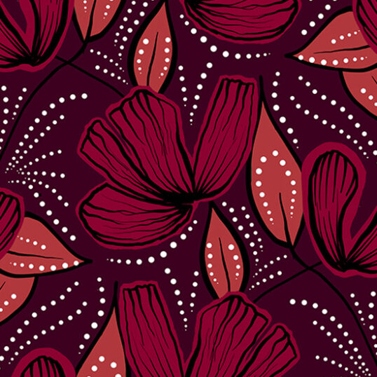 Hand illustrated moody floral hibiscus print with deep peach accents. This is a large-scale directional print with the main crimson motifs approximately 8cm in size and leaf motifs, approx. 6 cm in size.