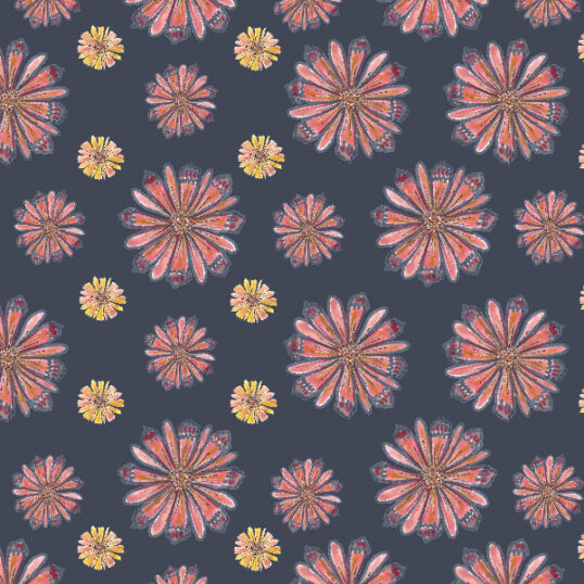 Daisy Drop is a simple but bold design using a combination of a large floral daisy motif 7cm wide and small daisy 3cm. Smokey blues with a warm golden daisy pop in watercolour and gouache.