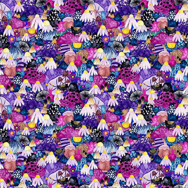 This complex smaller scale design sprung to life through my love for the natural world. I’m a long-time admirer of fungi and feel they are just as beautiful as many flowers, so incorporating them with flowers was a natural progression for this creation. Captured in all their organic glory, these flowers and fungi are simply stunning with these watercolour textures.