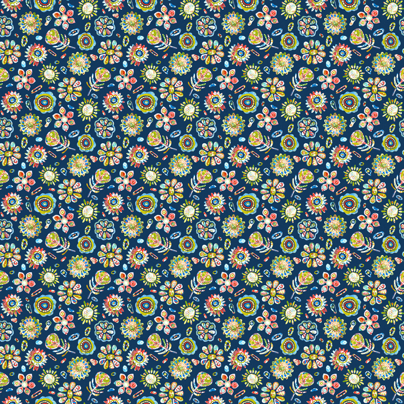 This colourful abstract flower pattern is made up of individual paper collages and hand printed paper. This is the small-scale pattern. The largest flower is about 2.5cm.