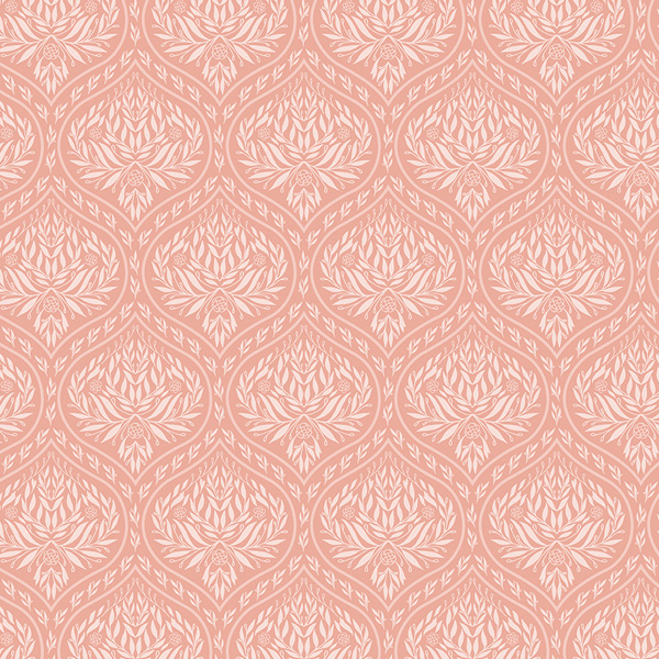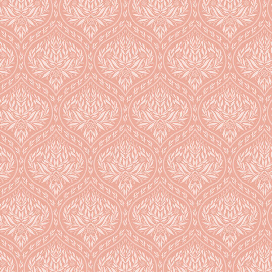 ‘Grevillea Ogee’ simplifies the bold palette of ‘Grevillea in Bloom’ to re-imagine the motifs in shades of pink coral. This medium, monochrome design has a subtle appeal in its details and calming palette. The ogee shape measures 9.5 cm while the lar