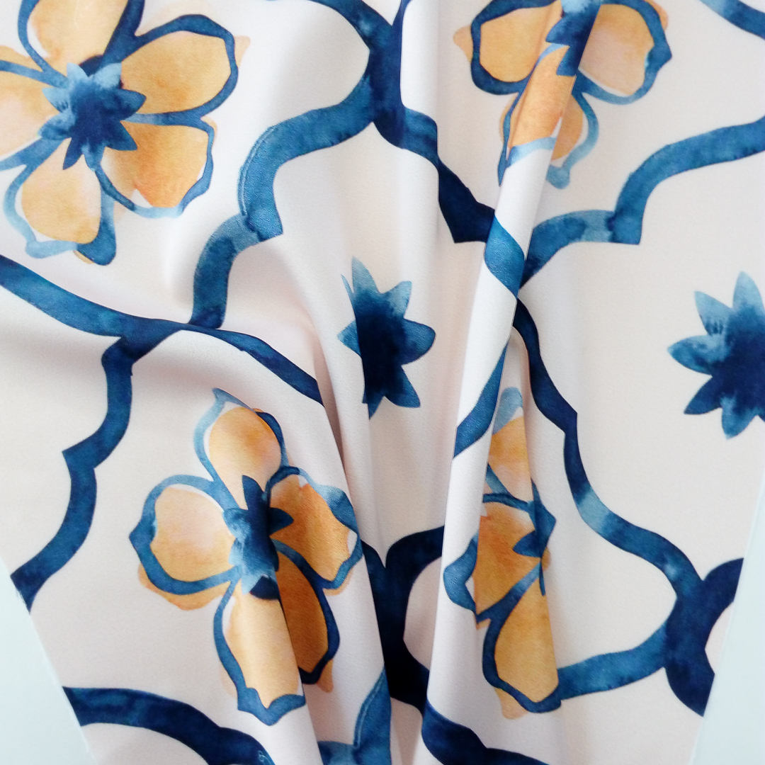 Indigo Trellis gives an organic feel to a tessellating design. The golden flowers simply pop in this design’s warm colour palette. Flower motifs range from 5cm and 10cm in width. Design printed on high quality fabric, please pick your fabric base in the drop-down menu below. Fabric is measured, cut and sold by the metre.