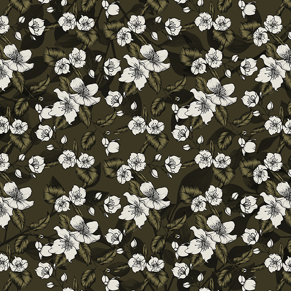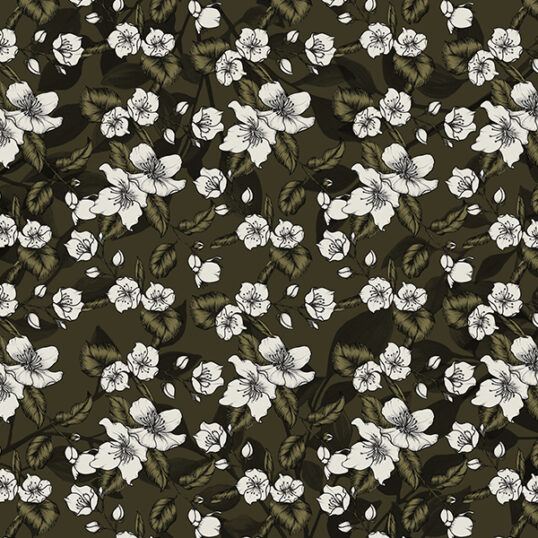 This small-scaled pattern with floral motifs varying between 0.5cm and 3cm in width fits very well both Men and Women’s wardrobes. With a dark olive background, Jasmine Jungle is a delicate and yet utilitarian print that can fit perfectly in daily cl