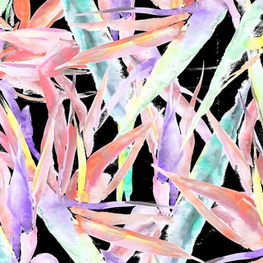 Dance till the dawn, dance day and night! Tropical Birds of Paradise hand painted print design with bright striking colours on black background. Design printed on high quality fabric, please pick your fabric base in the drop-down menu below. Fabric is measured, cut and sold by the metre.