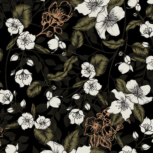 Night Jasmine is a dark and mysterious floral print that celebrates the beauty in elegance. The mix between fully painted motifs with colourful outlined florals gives movement and pops of light to the print. Night Jasmine is a medium-scale print with