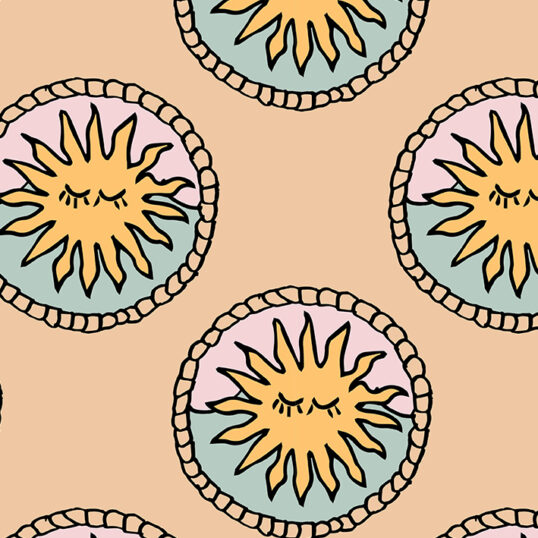The Ocean Folk print features the retro hand drawn sun and rope frame. Inspired by ocean roaming from sun up to sun down. The muted retro inspired colour palette of soft yellow, pink and blue against the tan background, is reminiscent of warm, hazy coastal holidays.