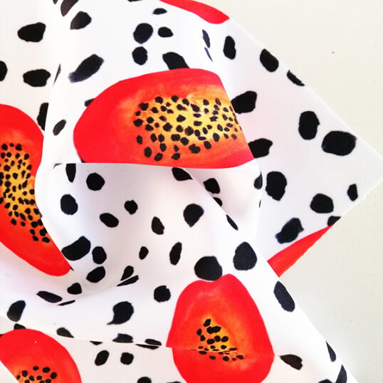 One of my favourite fruits, this fun papaya pattern reminds me of childhood summer afternoons in Queensland, eating local tropical fruits, cracking macadamia nuts from the tree in the backyard, watching an afternoon storm roll into town. Each papaya motif is around 8.5cm wide and 4.5cm wide and the spots are between 0.5cm -1.5cm each in size. Pattern Tile – 30 x 30cm. Design printed on high quality fabric, please pick your fabric base in the drop-down menu below. Fabric is measured, cut and sold by the metre.